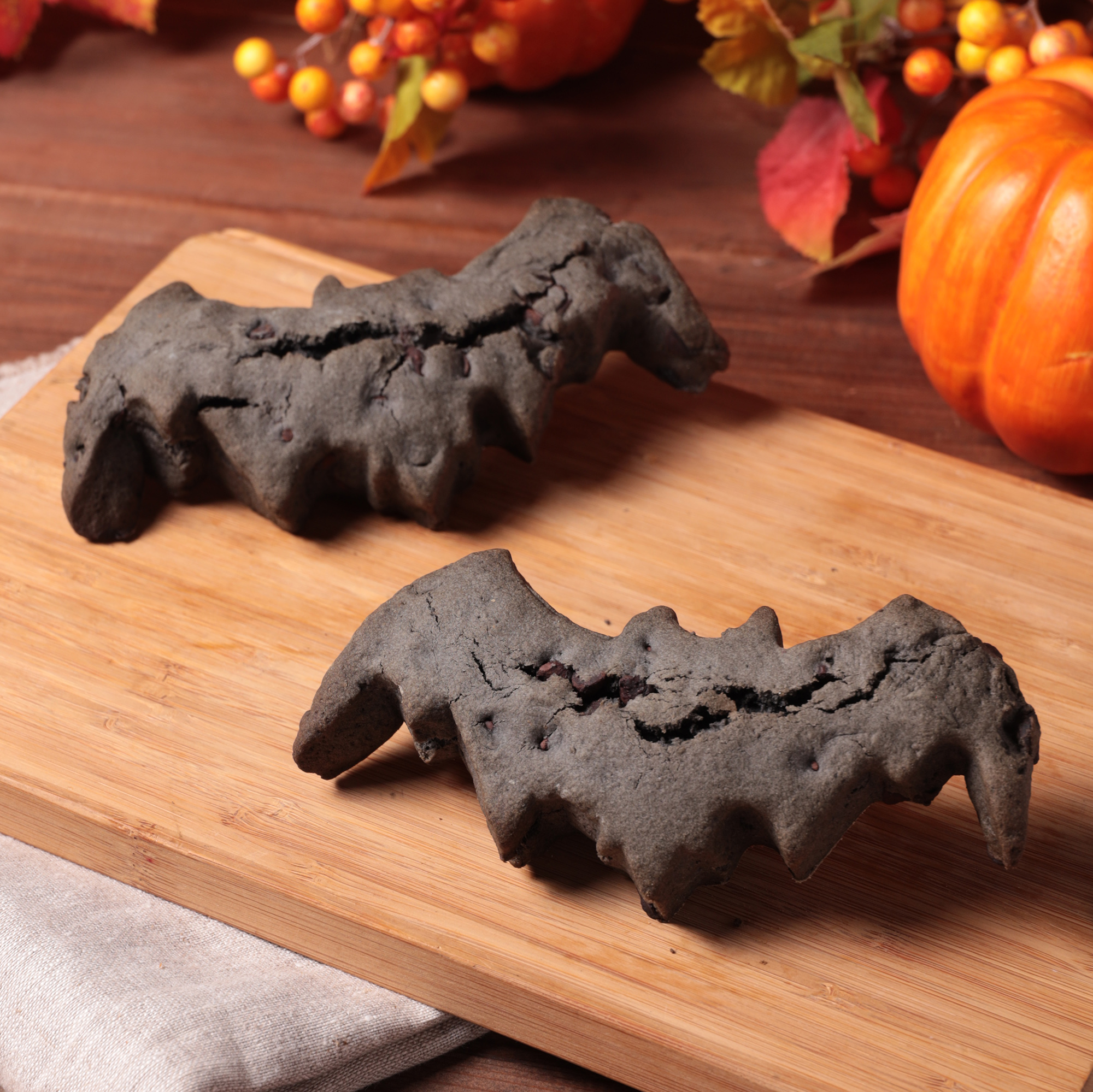 ブラックココアとチョコチップを混ぜ込んだ、ほんのりビターなスコーンをコウモリ型に焼き上げました。