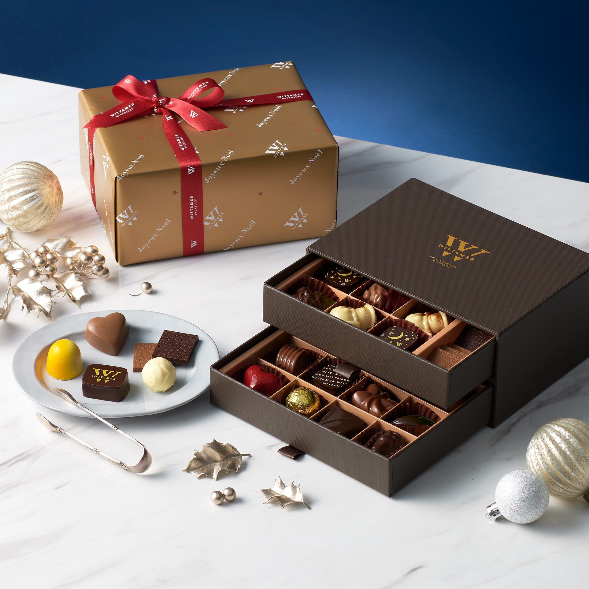 定番のプラリネやトリュフに雪だるまやツリーなどクリスマス限定ショコラを合わせた味わい豊かなショコラの詰め合わせ。