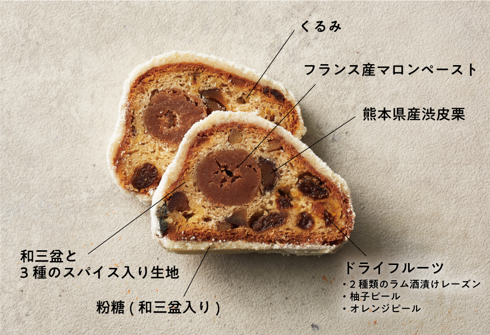 洋酒にじっくりと漬け込んだレーズンや柚子ピール、くるみと和三盆を合わせた3種のスパイス入りの生地で、和栗とマロンペーストを包み丁寧に焼き上げたHIBIKAオリジナルシュトーレンです。