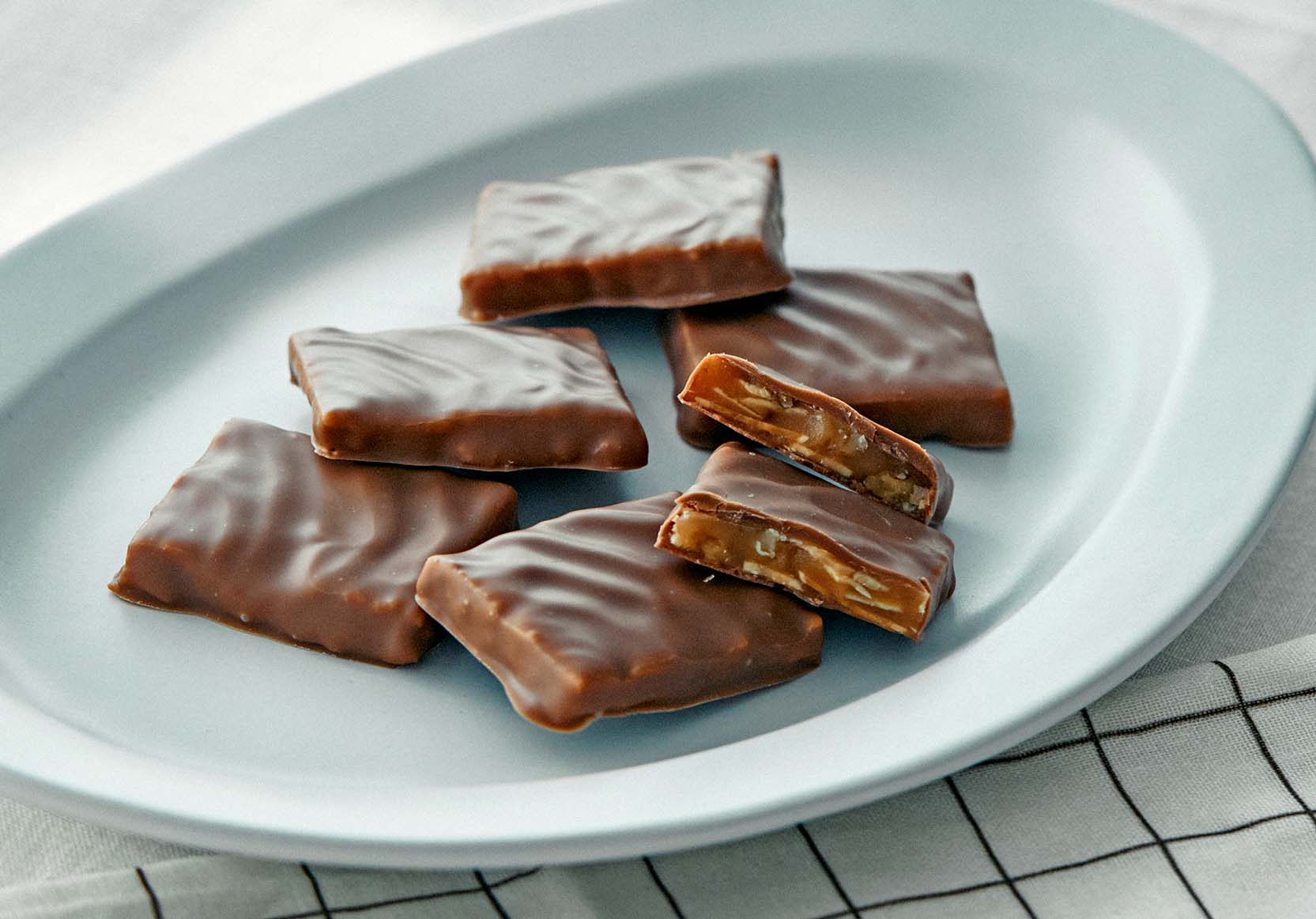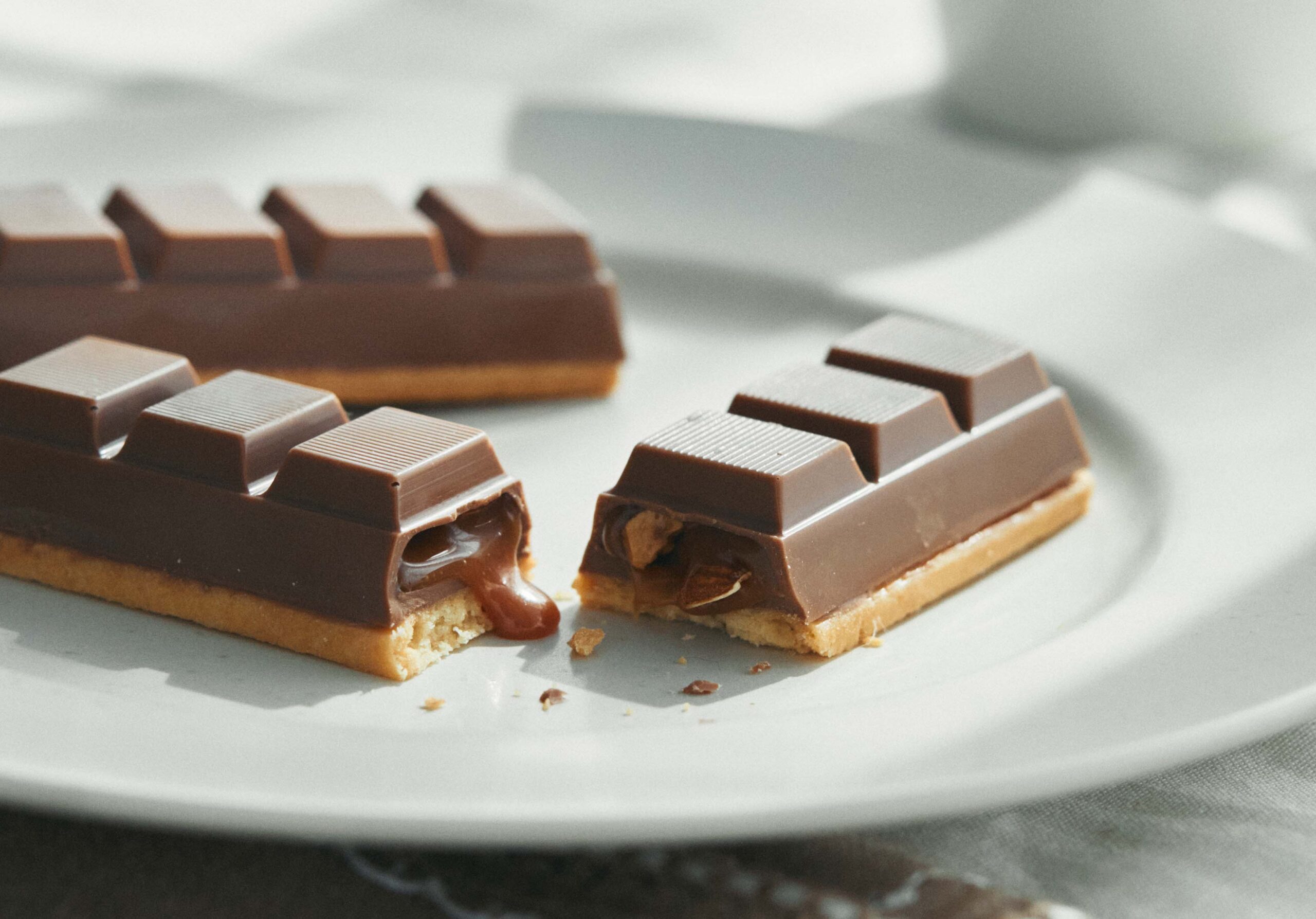 砕いたナッツを使った香ばしいクッキーの上に、濃厚な甘さのキャラメルソースを閉じ込めたMurirのミルクチョコレートを重ねました。ミルクチョコレートをパキッと割ると、たっぷり入ったキャラメルがとろり。魅力的な断面に魅せられて。