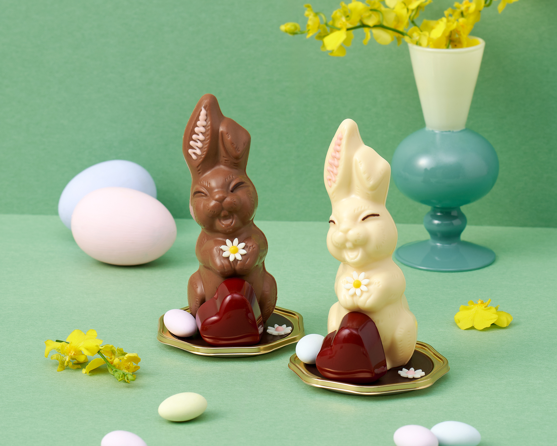 贈り物にもぴったりの笑顔が愛らしいうさぎのチョコレート。ヘーゼルナッツのプラリネをとじ込めたハートのショコラとドラジェを添えて。ミルクチョコレートとホワイトチョコレート、2つの味をご用意しております。
